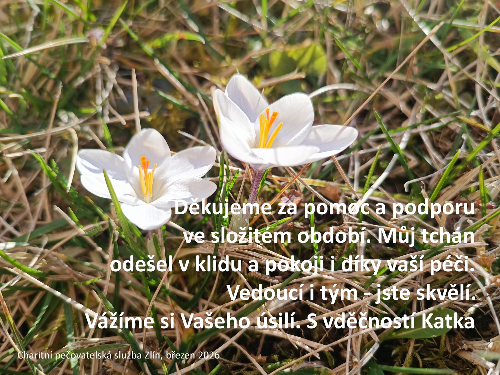 Dobrý den, paní vedoucí, moje maminka o kterou pečujete 3x týdně, nastupuje od prosince do domova seniorů. Tím pádem ukončuji spolupráci s firmou Charita. Musím vám všem moc poděkovat, hlavně pečovatelkám, za perfektní služby, profesionální přístup a výbornou komunikaci. Jsem moc ráda, že jsem měla štěstí při oslovení o pomoc Charitu Zlín. Ještě jednou, díky! S pozdravem Hana B.
